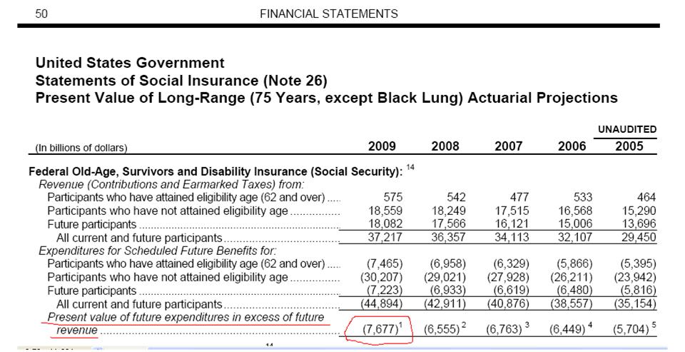 W zeszłym roku oszacowałem prawdziwy poziom zadłużenia Polski na ponad 200% PKB. Na te sumę słada się oficjalny dług publiczny w wysokości ok 50% PKB oraz koszty obietnic emerytalnych na które nie ma oszczędności i które będą spłacone z bieżących podatków w wysokości ok 150%-200% PKB. W USA jest podobny problem. Kilka dni temu rząd amerykański opublikował Financial Report of the US Government 2009, który zawiera szacunek dziury w ich systemie ubezpieczeń społecznych, którą zasypać mają w przyszłości podatnicy.