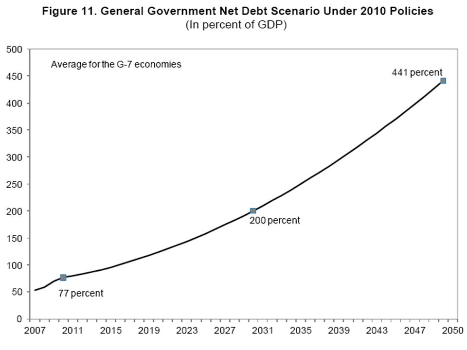 Szacunek zilustrowany na powyzszym wykresie nie odzwierciedla wpływu wyższego długu na wzrost kosztu pożyczania przez coraz bardziej zadłużone rządy, oraz spadku tempa wzrostu gospodarczego pod ciężarem długu. I bez tego wymowa wykresu jest prosta: spirala zadłużenia przed nami.