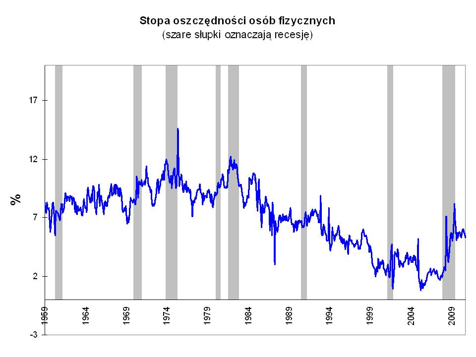 Do roku 1982 stopa oszczędności amerykanów wynosiła 8-10%. Po tym roku systematycznie spadała poniżej 2%. Teraz już trzeci rok z rządu stopa osczędności w USA rośnie: