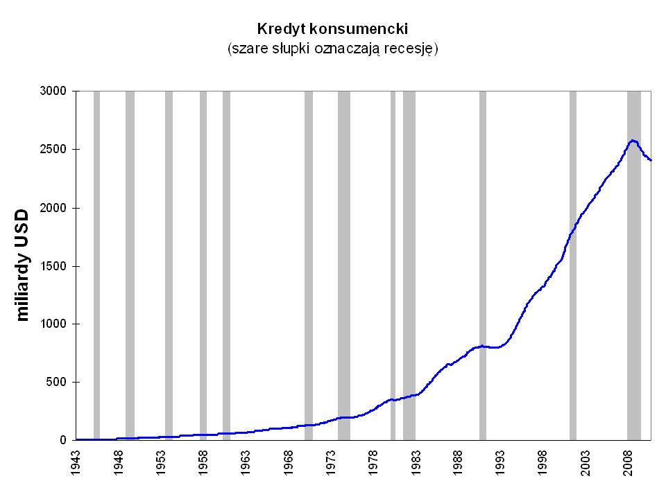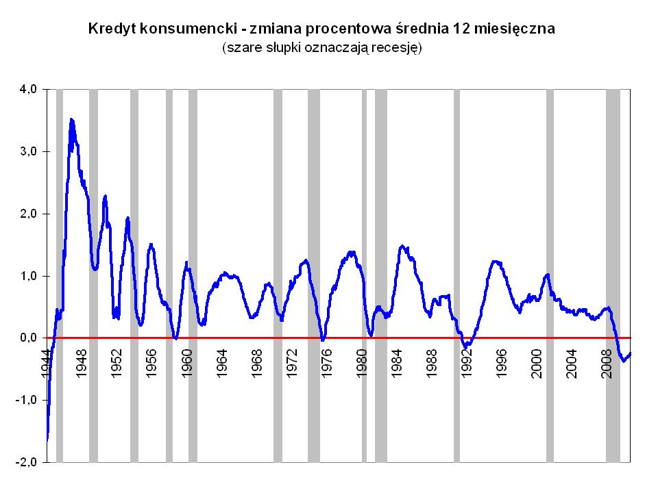Stanowi to ogromną zmianę ponieważ po raz pierwszy od wprowadzenia ograniczeń konsumpcji podczas drugiej wojny światowej wartość kredytu udzielonego amerykańskim konsumentom spadła w tak dużym stopniu: