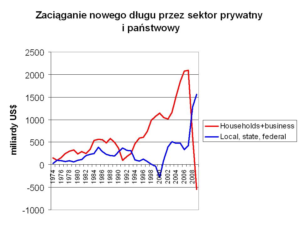 Po wybuchu kryzsu w 2007 konsument amerykański zaczął po raz pierwszy od ćwierćwiecza oszczędzać. Natomiast państwo amerykańskie w reakcji na wzrost oszczędności swych obywateli na potęgę zaczeło pożyczać. Takie zadłużanie się nie jest do utrzymania na dłuższą metę.