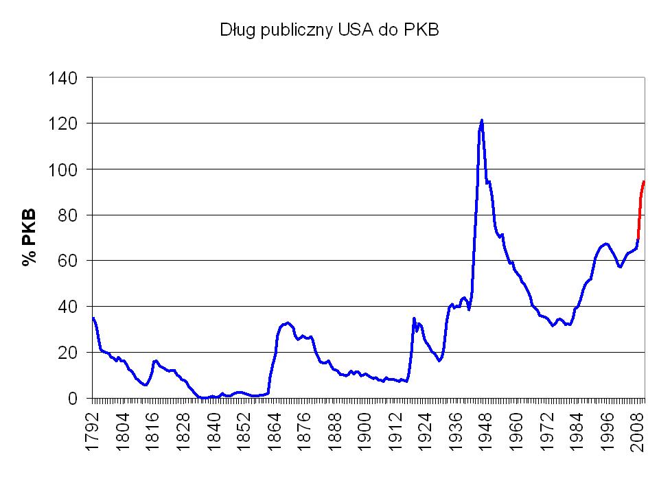 Powyższy wykres pokazuje zmiany w ilości zaciągniętego kredytu, tj. gdy linia jest powyżej zera długów przyrasta. Czym wyżej linia jest od zera tym szybciaj narasta dług. I odwrotnie gdy na powyższym wykresie linia jest poniżej zera długów ubywa. Ten ogromny przyrost zadłużenia zilustrowany powyżej skutkuje tym, że dług publiczny USA osiąga coraz wyższe poziomy. Na poniższym wykresie widzisz dług w relacji do PKB. USA zadłużyły się bardziej jedynie na finansowanie swojego udziału w drugiej wojnie światowej:
