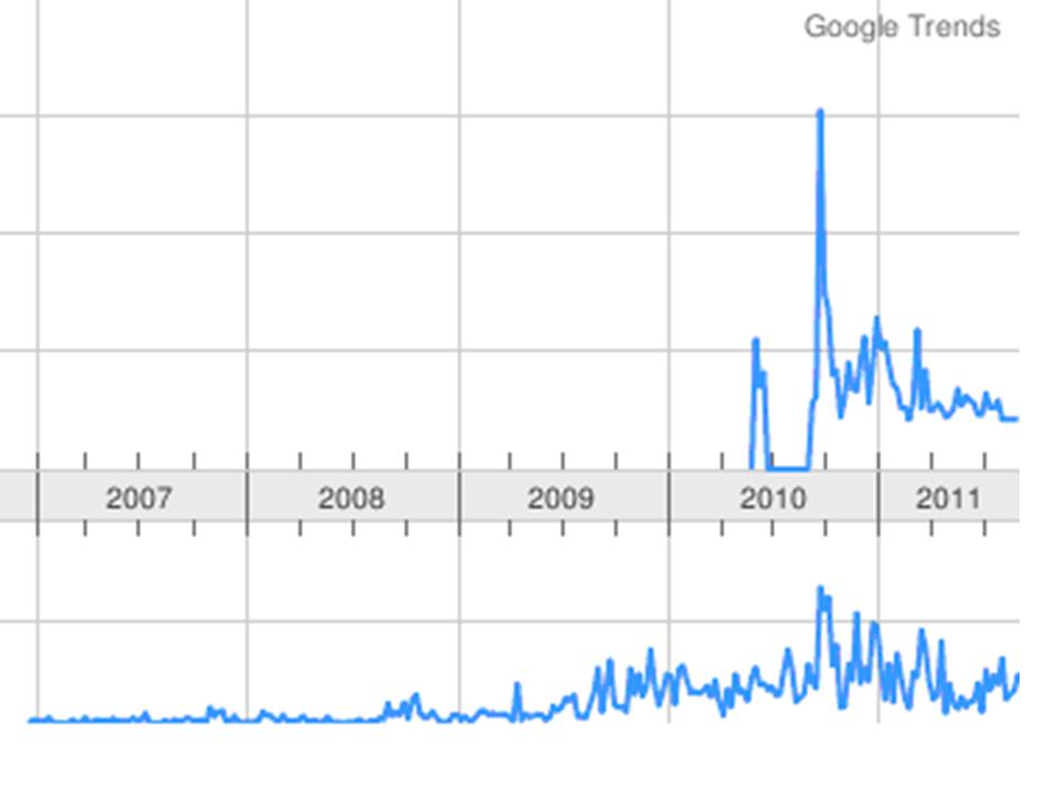 Poniżej widzisz dwa wykresy uzyskane za pomocą Google Trends. Ten wyższy obrazuje ilość zapytań o hasło „dług publiczny” w internetowej wyszukiwarce Google. Przed wrześniem ubiegłego roku, gdy postawiono licznik długu liość zapytań była nieistotna. We wrześniu ub.r. skoczyła i trzyma się cały czas dość wysoko: