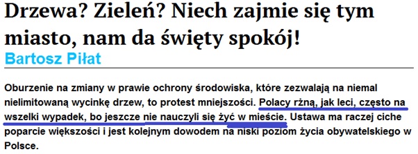 Panika moralna w temacie drzew ma silny ładunek klasizmu. Chamy i buraki, bez bata nad plecami popsują jaśniepaństwu Polskę. Paniczyki z Kultury Liberalnej twierdzą wręcz, że rżniemy drzewa jak leci, bo jeszcze się nie nauczyliśmy żyć w mieście: