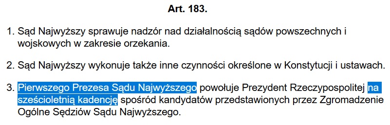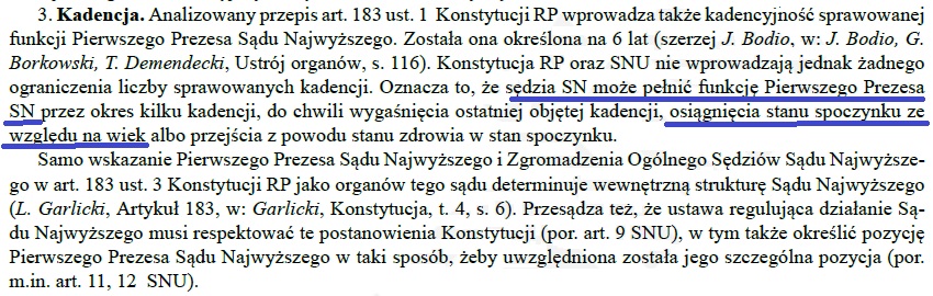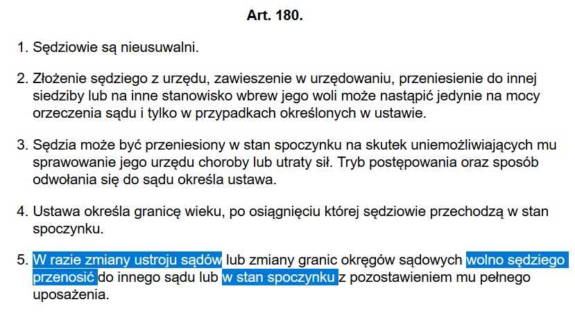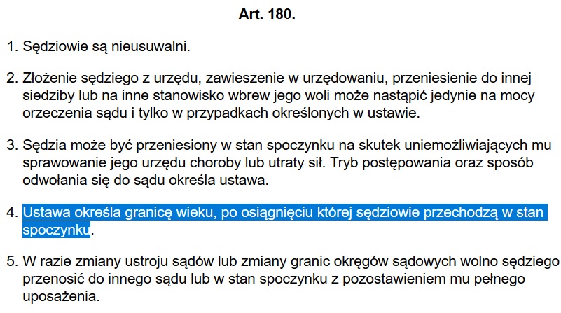 …o tym, że z konstytucji jasno wynika, że Gersdorf jest, lub że nie jest pierwszym prezesem sądu najwyższego („PPSN”). Nasza kiepska konstytucja nie daje na to pytanie jednoznacznej odpowiedzi. Z jednej strony mamy art. 180, który wyraźnie stwierdza, że to władza ustawodawcza ma prawo kształtować ustój sądów, w tym wiek spoczynku sędziów: