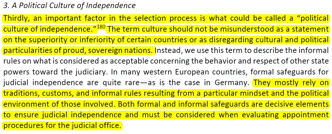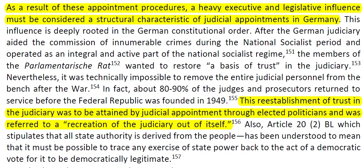 W naukowych publikacjach autorzy niemieccy przyznają, że ich o wiele bardziej upolityczniony wybór sędziów, z o wiele większym wpływem władzy wykonawczej i prawodawczej niż w Polsce był reakcją na narodowy socjalizm: