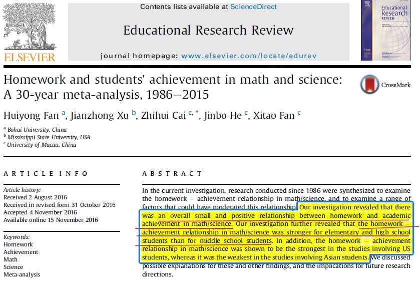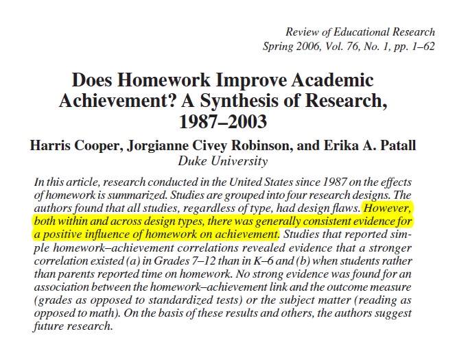 Ponad pół wieku literatury naukowej o wpływie prac domowych na wynik nauczania nie daje jednoznacznej odpowiedzi. Suma badań zdaje się być szeroko i lekko pozytywna dla pracy domowej, ale z wieloma zastrzeżeniami. Tu jeden niedawny przykład: