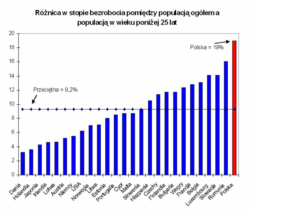 Bezrobocie w Polsce ma dwie charakterystyczne cechy. Po pierwsze, o czym powszechnie wiadomo, bezrobocie jest wysokie. Po drugie, o czym większość Polaków nie wie, bezrobocie młodych jest horendalnie wysokie. Mamy największą w cywilizowanym świecie różnicę pomiędzy poziomem bezrobocia młodych i starych: