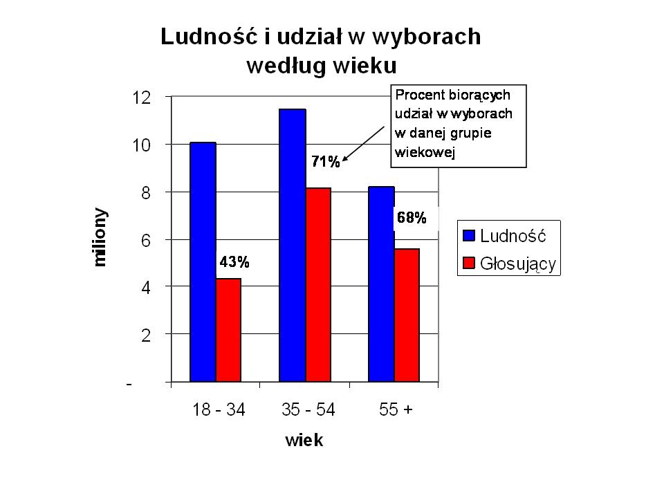 W wieku 18-34 lat jest ponad 10 milionów Polaków, ale tylko 4,3 miliona wyborców. Natomiast w wieku 55 lat i więcej jest tylko 8 milionów Polaków, ale aż 5,5 miliona wyborców.
